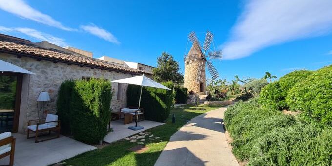 Le parcours s’accompagne d’un boutique-hôtel de 28 chambres, installé dans une ancienne finca du XVIᵉ siècle et son moulin, le tout restauré avec élégance. Pierres apparentes, poutres en bois, décoration sobre et chaleureuse composent une atmosphère où la tradition majorquine et confort moderne se rejoignent.